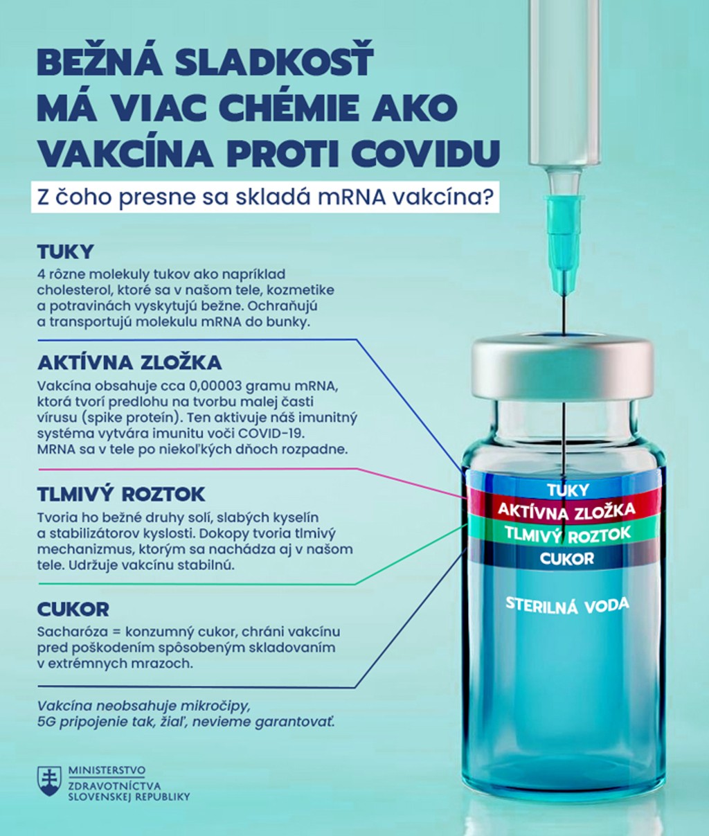 „Ak vám niekto povie, že si do seba nechce ‚pichať chémiu‘, opýtajte sa ho, či vie, z čoho sa táto vakcína skutočne skladá a z čoho sa skladal jeho posledný nákup v potravinách,“ dodáva ministerstvo zdravotníctva.