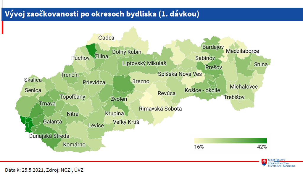 K dňu 26. mája sme evidovali celkovo 1 636 436 ľudí, ktorí dostali aspoň prvú dávku vakcíny. Podľa dostupných údajov, ktoré zverejňuje Inštitút zdravotných analýz čaká v Čakárni 110 926 ľudí. Títo ľudia už prejavili záujem o očkovanie registráciou. Ak ich pripočítame k zaočkovaným, môžeme rátať s celkovým počtom 1 764 788 zaočkovaných ľudí na Slovensku.