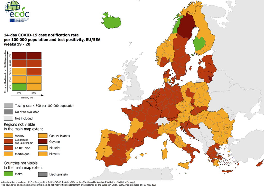 Na mape, ktorú zverejňuje Európske centrum pre prevenciu a kontrolu chorôb, vidno, že situácia sa v jednotlivých krajinách dosť líši. Tie, ktoré sú prevažne žlté, zaznamenali v uplynulých dvoch týždňoch najmenej nových prípadov na 100-tisíc obyvateľov. Naopak, čím je farba tmavšia, tým je nových prípadov viac. Najlepšia situácia je dlhodobo na Malte a na Islande, ktorý je v našom cestovateľskom semafore tiež zelený, hoci nie je v Únii, podobne ako Nórsko. Dobre sú na tom aj Fíni, Rumuni a Portugalci. Jedna krajina za druhou uvoľňuje opatrenia. Tento víkend to urobili okrem Nemcov napríklad Chorváti, ktorí otvorili pre hostí aj interiéry reštaurácií, povolili aj svadby a festivaly.