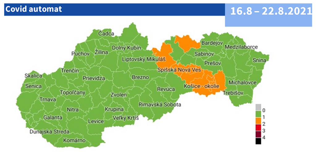 Od pondelka (16.8.) vstúpi do platnosti nový COVID automat. Pre zhoršujúcu sa epidemiologickú situáciu zmení farbu šesť okresov. V oranžovej fáze budú Košice I – IV, Košice okolie, Gelnica, Spišská Nová Ves, Poprad a Stará Ľubovňa. Zvyšok krajiny zostáva zelený.