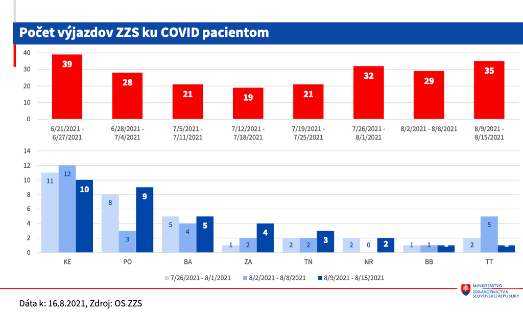 V polovici augusta bolo dokopy 35 výjazdov ku covidovým pacientom. Predchádzajúci týždeň ich bolo 29. Najviac výjazdov je v Košickom a Prešovskom kraji. Najvyšší nárast zaznamenal Prešovský kraj. Kým prvý augustový týždeň zaznamenali tri výjazdy, o týždeň neskôr to už bolo deväť.