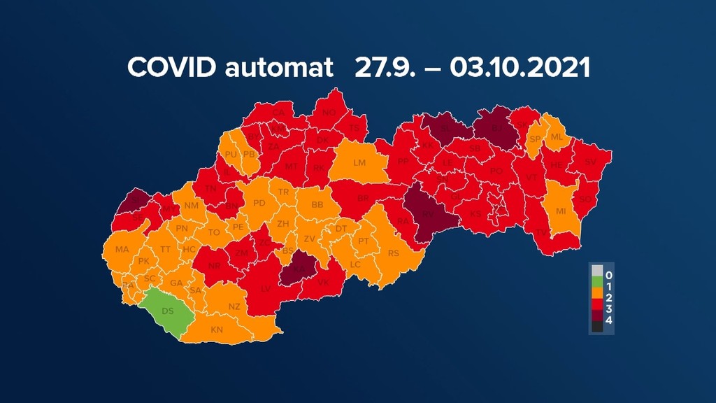 Slovensko sa podľa COVID automatu od pondelka zafarbilo oranžovo-červenými farbami. Zelený ostal už len okres Dunajská Streda. K štyrom bordovým okresom pribudla aj Stará Ľubovňa. Červených je už 39 okresov, čo znamená, že na väčšine územia sa už neočkovaní bez testu nedostanú do reštaurácie.
