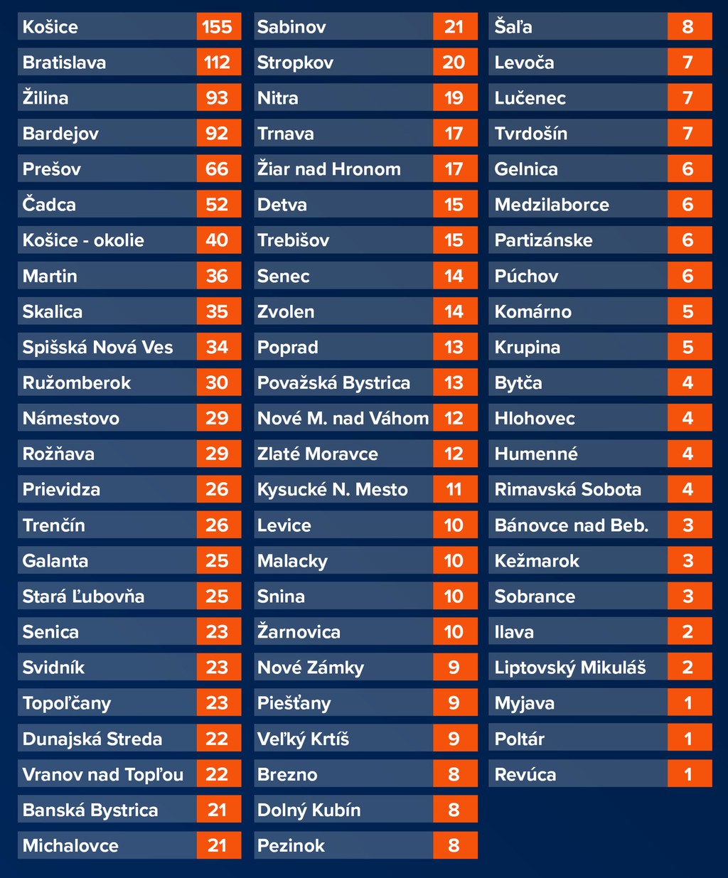 Najvyšší počet nových prípadov hlásia mestá Košice a Bratislava. V rámci okresov nasledujú Žilina a Bardejov. Kompletný zoznam nájdete v tabuľke: