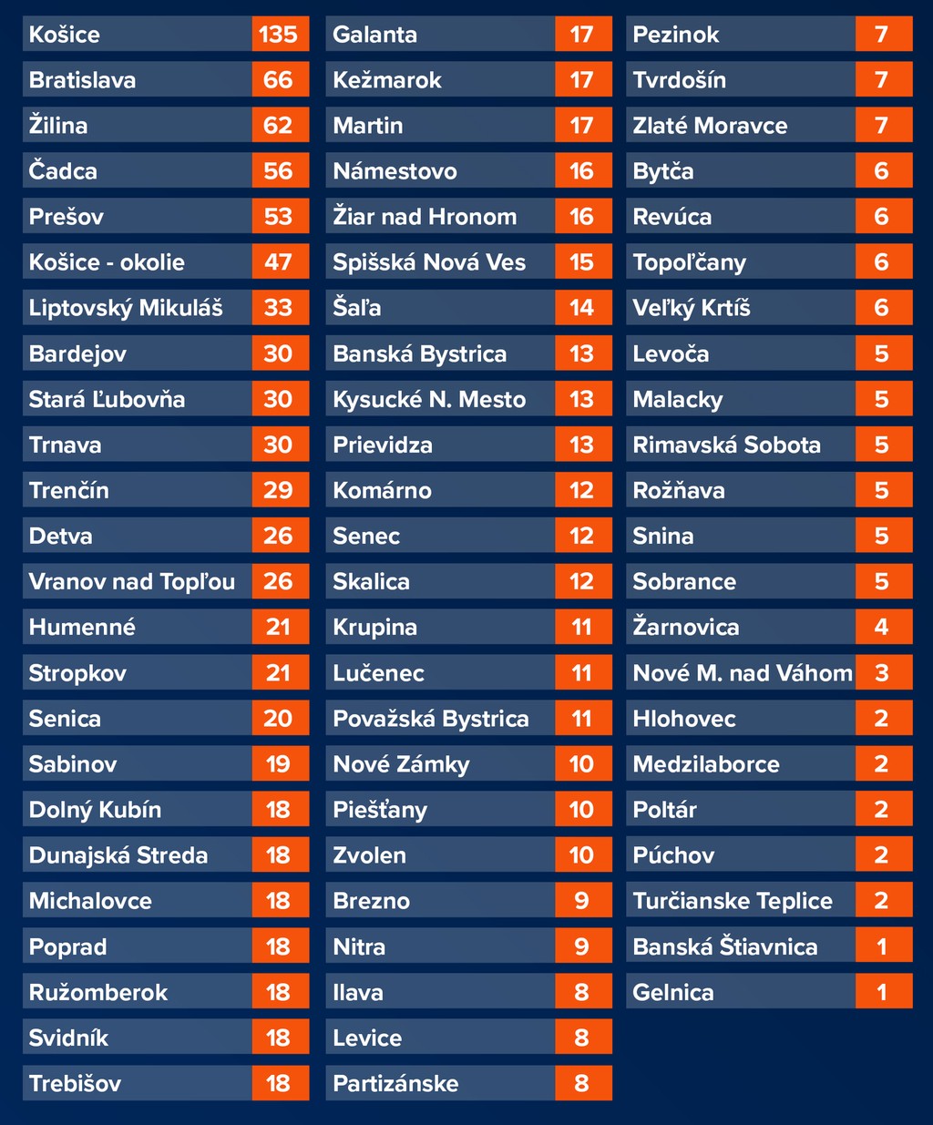 Najviac prípadov hlásia opäť Košice, nasleduje Bratislava. Zoznam jednotlivých okresov a počty infikovaných nájdete v tabuľke: