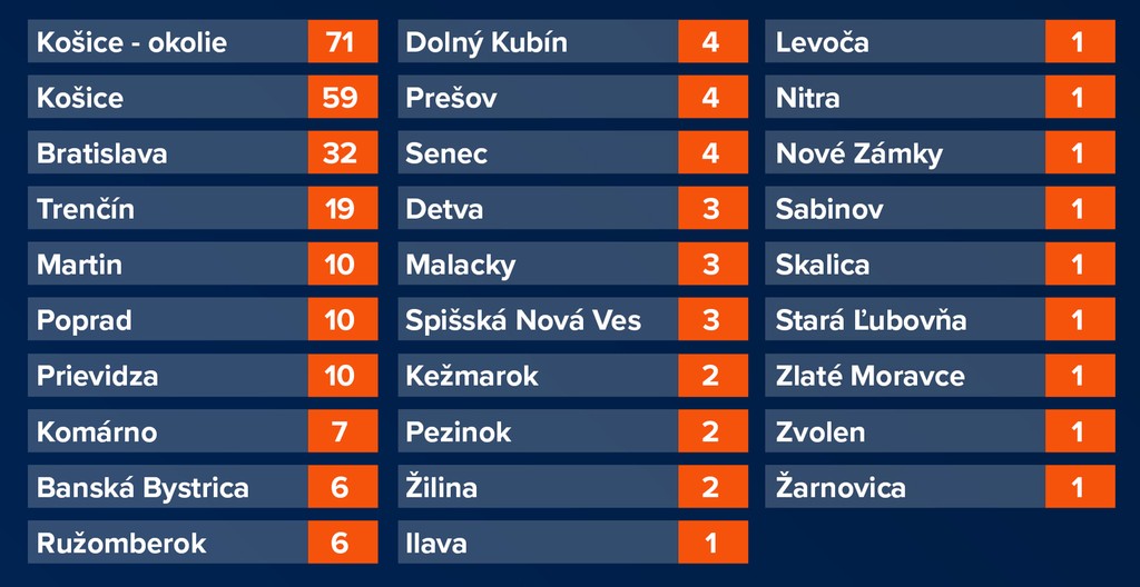 Najviac pozitívne testovaných PCR testami bolo v Košickom kraji (133), nasleduje Bratislavský (41), Trenčiansky (30), Žilinský (22), Prešovský (19), Banskobystrický (11) a Nitriansky (10) a Trnavský (1).