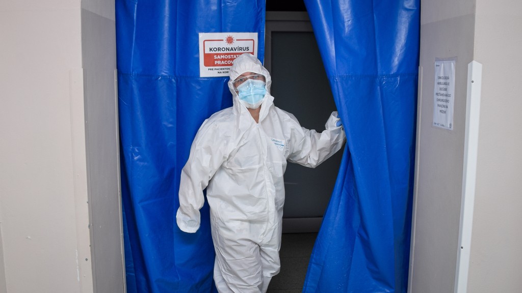 Najprv prejdeme dverami, za ktorými je modrý záves s nápisom: Koronavírus. Samostatné pracovisko. Pre pacientov s podozrením na koronavírus. Sme v nemocnici Svet zdravia Rimavská Sobota na covidovom oddelení.