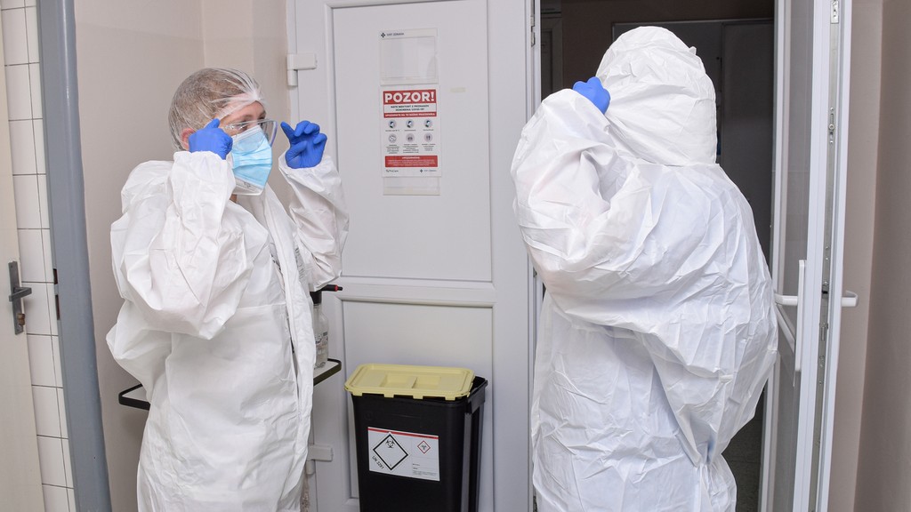 Napriek tomu ideme. Prvá zastávka je šatňa, ktorá je plná škatúľ s ochrannými pomôckami. Na oblečenie si dávame jednorazovú sterilnú košeľu a nohavice. Vyzerá to ako oblečenie, ktoré nosia lekári na operácie. Na to nám sestrička oblieka vysoké návleky na topánky. Na hlavu si dáme jednorazovú čiapku. Nasleduje najhoršia časť - kombinéza. Natiahneme si ju na seba, dáme si kapucňu a zapneme až po bradu. Samozrejmosťou je respirátor a na ňom rúško. Už po chvíli mi začína byť teplo.