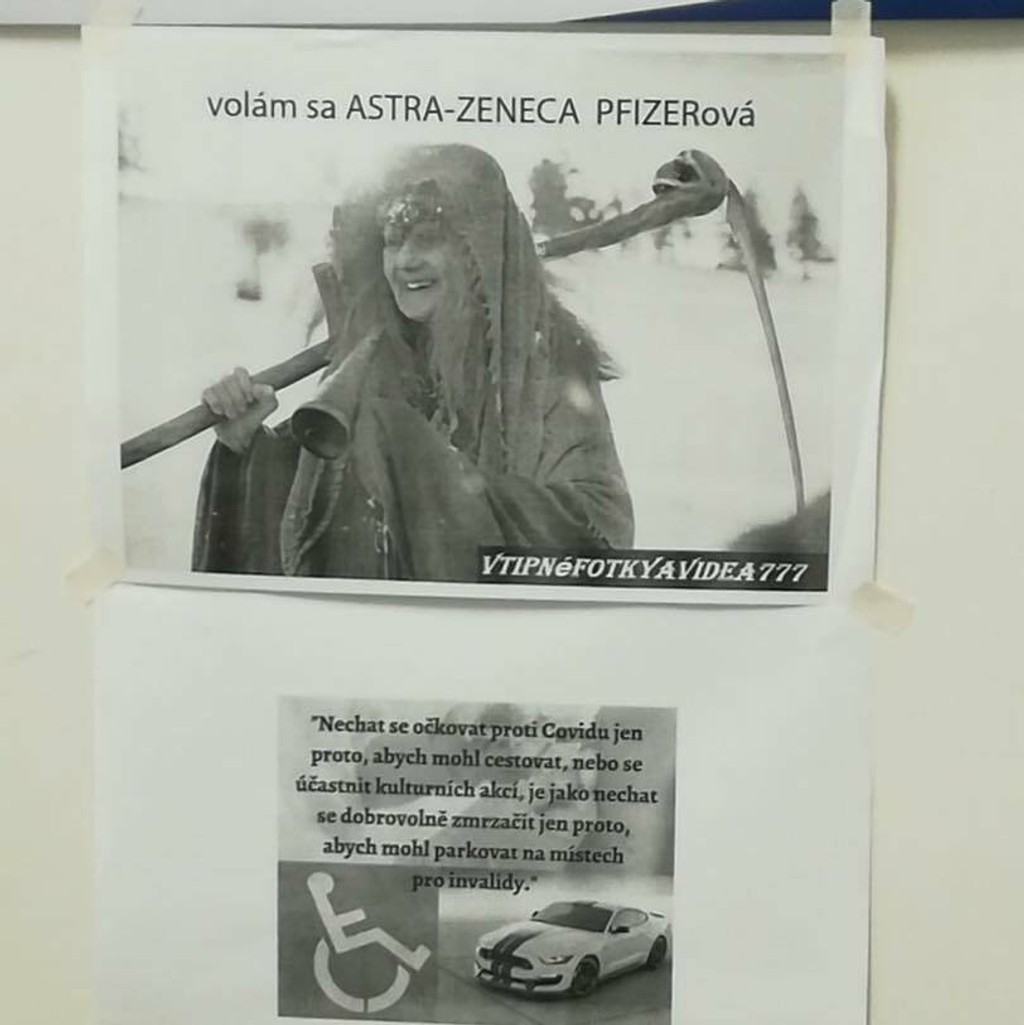 Tá mala na vchodových dverách do ambulancie plagát, ktorý vystríhal pred očkovaním. Na snímke bola zubatá z Parinbaby s nápisom volám sa ASTRA-ZENECA PFIZRová.