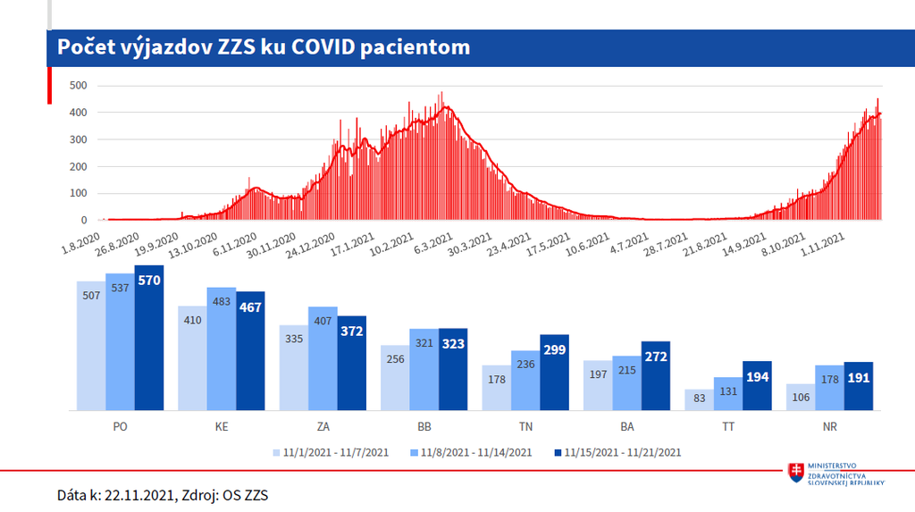 Za týždeň zaznamenal Bratislavský kraj 272 výjazdov sanitiek ku covidovým pacientom. Za sedem dní sa počet výjazdov zvýšil o 57. Nárast potvrdila aj hovorkyňa Univerzitnej nemocnice Bratislava Eva Kliská.