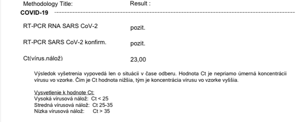 Jedno zo súkromných laboratórií napríklad uvádza, že hodnota Ct pod 25 hovorí o vysokej vírusovej náloži. Ct nad 35 značí nízku nálož.