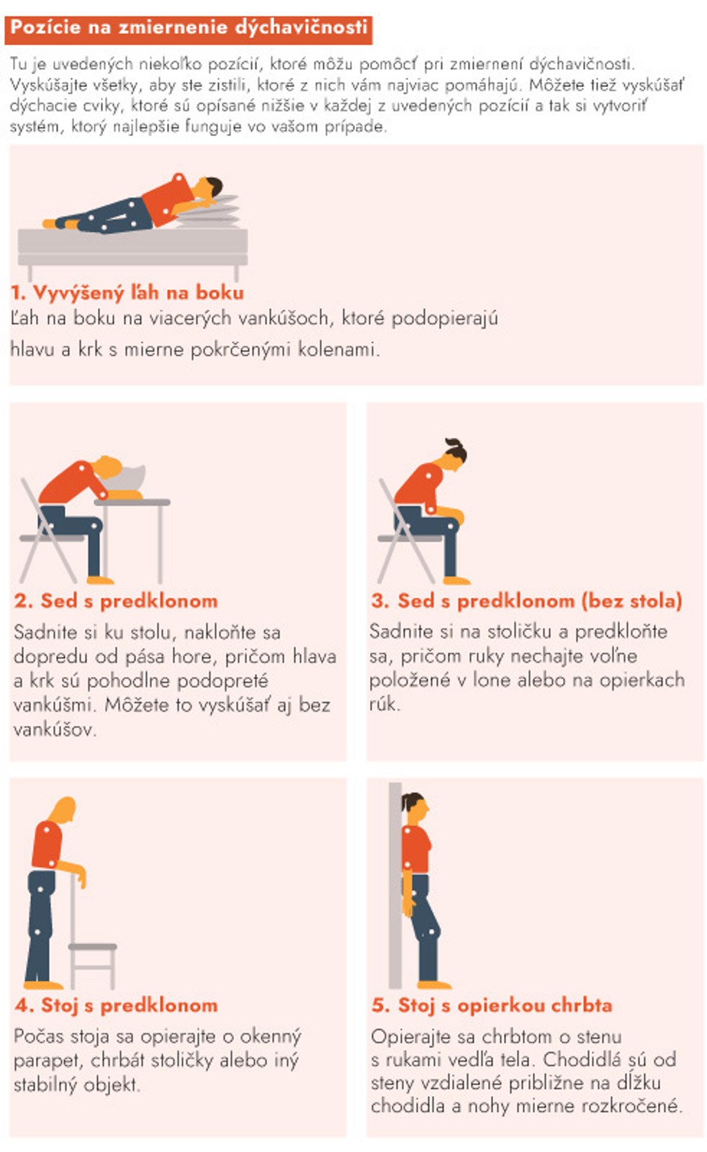 Rozdeľte si činnosti na menšie úseky, aby ste neboli na konci priveľmi unavení alebo zadýchaní. Napr. predtým, ako vystúpite na schod sa nadýchnite a už pri stúpaní na schod, vydýchnite. Môže vám pomôcť, že sa nadýchnete nosom a vydýchnete ústami.