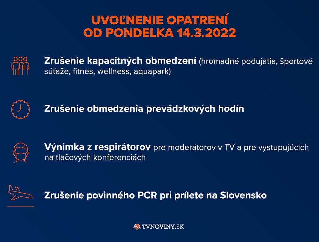 Úrad verejného zdravotníctva (ÚVZ) SR zverejnil vo štvrtok nové vyhlášky, ktoré reagujú na uvoľnenie pandemických opatrení vládou. Od 14. marca sa rušia kapacitné obmedzenia na hromadných podujatiach i obmedzenia prevádzkových hodín. Nosenie respirátorov bude naďalej povinné, výnimku budú mať napríklad televízni moderátori. Zároveň sa zruší povinné PCR testovanie po prílete na Slovensko z rizikových krajín.