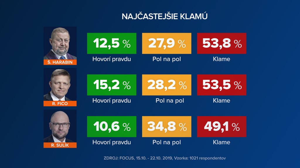 O lídrovi Vlasti Štefanovi Harabinovi si viac ako polovica opýtaných myslí, že väčšinou alebo takmer vždy klame (53,8%). Takmer rovnako skončil predseda Smeru Robert Fico s 53,5 percentami. Takmer 50 percent si to myslí o Richardovi Sulíkovi. Podľa opýtaných najmenej klame prezidentka Zuzana Čaputová (21,3%).