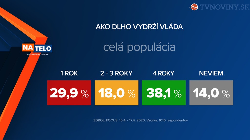 Agentúra Focus realizovala prieskum v dňoch 15. až 17.apríla 2020. Pýtali sa 1016 respondentov, ktorým položili otázku: Čo si myslíte, ako dlho vydrží súčasná vláda Igora Matoviča?