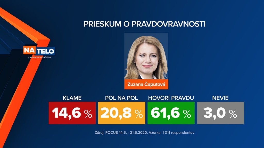 Z prieskumu vyšla najlepšie prezidentka Zuzana Čaputová. Z opýtaných uviedlo, že hovorí pravdu 61,6 percenta ľudí. Naopak, 14,6 percenta si myslí, že prezidentka klame. Pätina (20,8 percenta) opýtaných si myslí, že jej vyjadrenia sú "pol na pol".