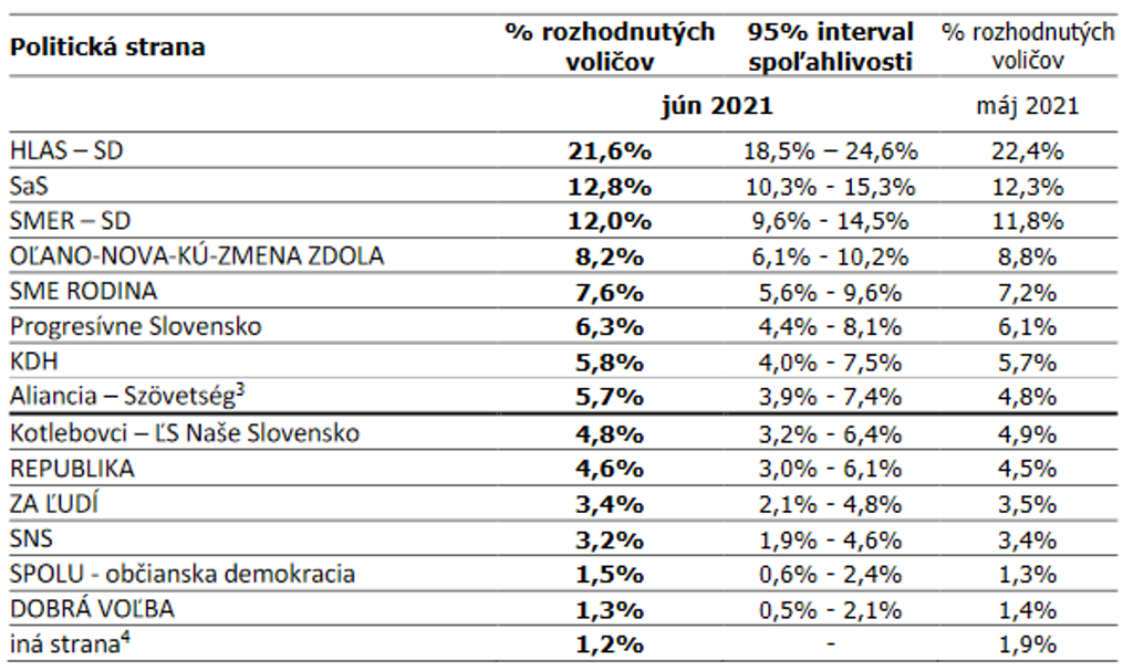 Ak by sa parlamentné voľby konali v júni, tak by ich podľa prieskumu agentúry Focus pre TV Markíza vyhral opozičný Hlas s viac ako 21 percentami. Druhou najsilnejšou stranou by bola s takmer 13 percentami koaličná SaS. Prvú trojku by uzatváral Smer s rovnými 12 percentami.
