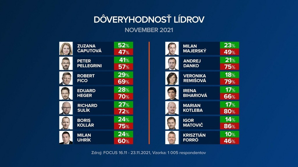 Na čele sa drží prezidentka Čaputová, ktorej dôveruje 52 percent opýtaných a nedôveruje jej 47 percent voličov. Jej dôveryhodnosť sa oproti septembru zvýšila o tri percentálne body. Nasleduje líder Hlasu Peter Pellegrini, ktorému vyslovilo dôveru 41 percent voličov, naopak 57 percent opýtaných vyjadrilo nedôveru.