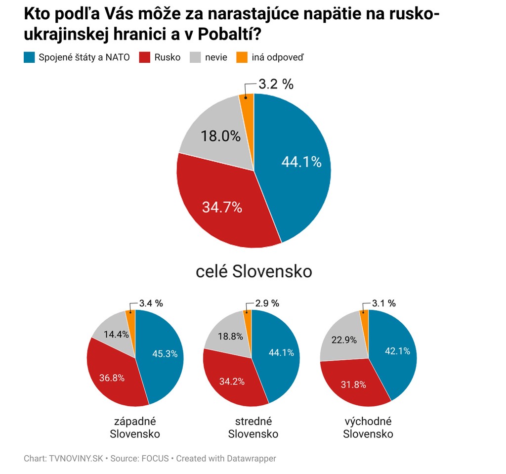 Zaujímavý pohľad je aj názor voličov jednotlivých strán. Kým väčšina voličov strán SaS, OĽaNO, PS a Aliancia z napätia vinia Rusov, tak priaznivci Smeru, Republiky a ĽSNS v drvivej väčšine súčasnú situáciu dávajú za vinu Američanom a NATO.