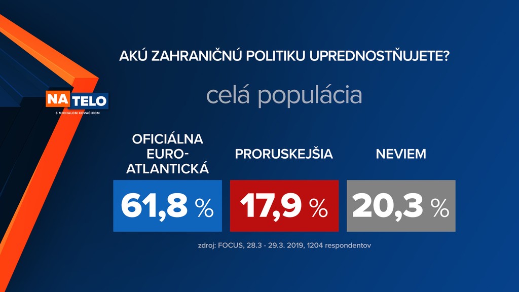 Podľa prieskumu agentúry Focus pre TV Markíza si až 60 percent populácie myslí, že by sme naďalej mali presadzovať euroatlantické smerovanie. Necelých 18 percent opýtaných zas tvrdí, že by sme mali byť viac proruskejší.