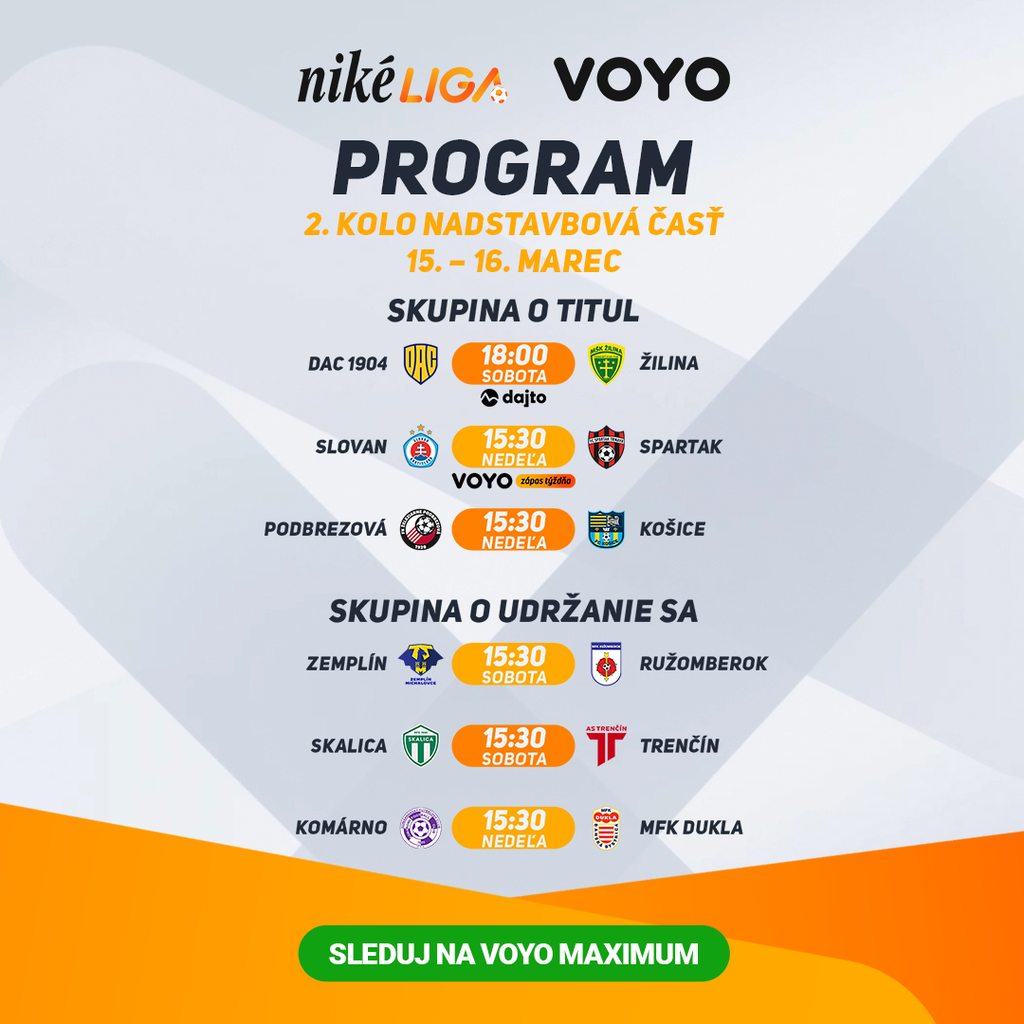 Okrem tohto očakávaného duelu sa bude bojovať o dôležité body aj na ďalších štadiónoch. V rovnakom čase vyzve v skupine o titul na svojom trávniku Podbrezová Košice. Už o deň skôr od 18-tej sa uskutoční aj atraktívny súboj, keď druhá Žilina zavíta na Žitný ostrov, kde vyzve nebezpečnú Dunajskú Stredu.