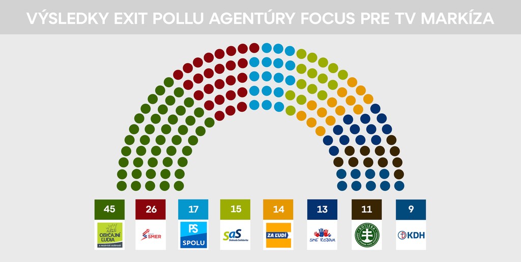 Podľa exit pollu televízie Markíza by víťaz volieb OĽaNO získalo 45 kresiel v parlamente. Nasleduje Smer s 26 poslancami. Koalícia PS/Spolu by obsadila 17 miest, SaS by mala 15 poslancov.