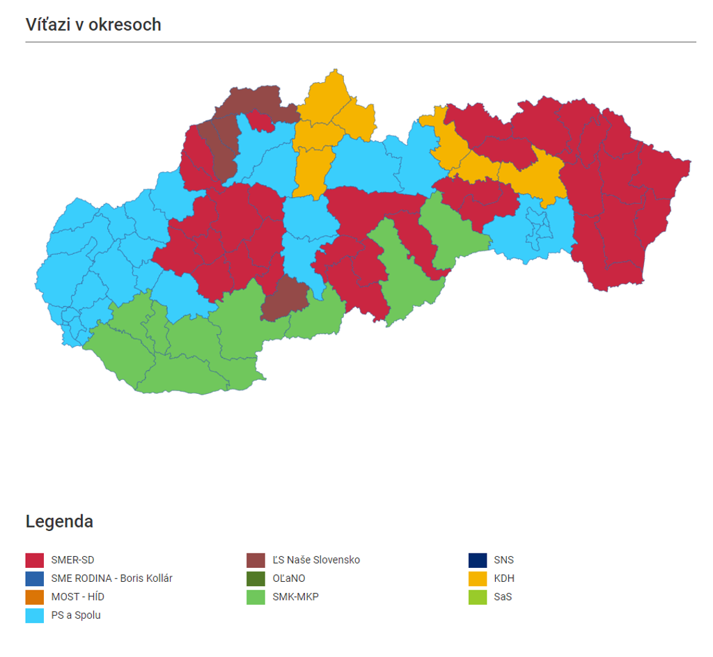 Najviac víťazných okresov má Smer-SD, napriek tomu, že voľby nevyhral. Väčšinu hlasov získal až v 31 okresoch. O tri menej (28) má na svojom konte koalícia Progresívneho Slovenska a Spolu.