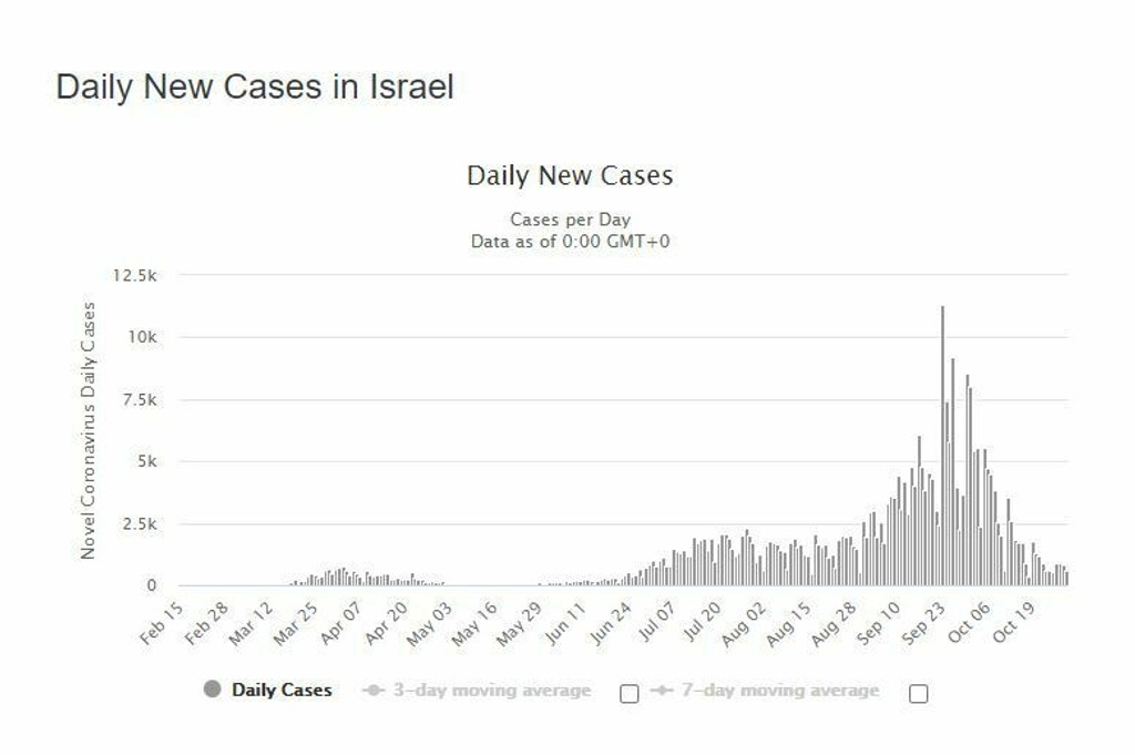 Situácia v Izraeli sa začala postupne zhoršovať v septembri, kedy denný prírastok pozitívne testovaných prekonal trojtisícovú hranicu. Denný rekord v počte nakazených evidoval Izrael 23. septembra. V tento deň pribudlo až 11 316 nových prípadov.