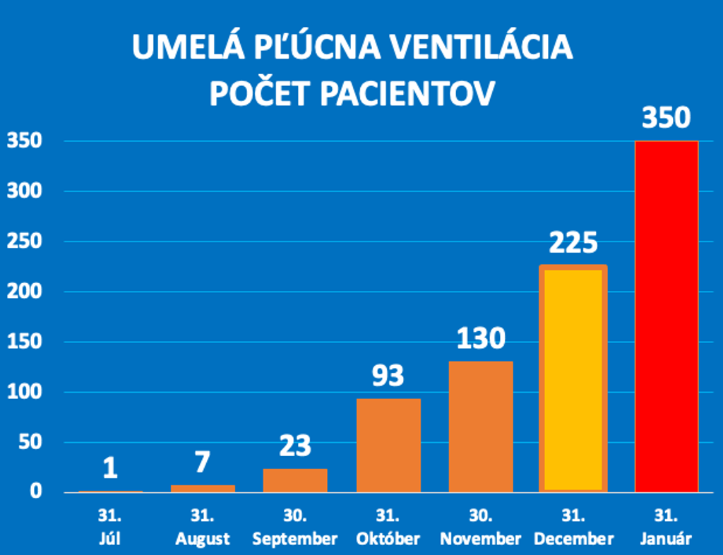 Celkovo máme k dispozícii zhruba 500 lôžok s umelou pľúcnou ventiláciou. Problém je, že nám rýchlo rastie počet pacientov, ktorí ju potrebujú. Kým začiatkom decembra ich bolo napojených 130, dnes je ich už 217. Keď ale prístroj potrebuje pacient v Nitre, nepomôže mu, že voľné lôžko je v Prešove. Pacient potrebuje byť napojený okamžite a jeho prevoz na takú dlhú vzdialenosť nie je možný.