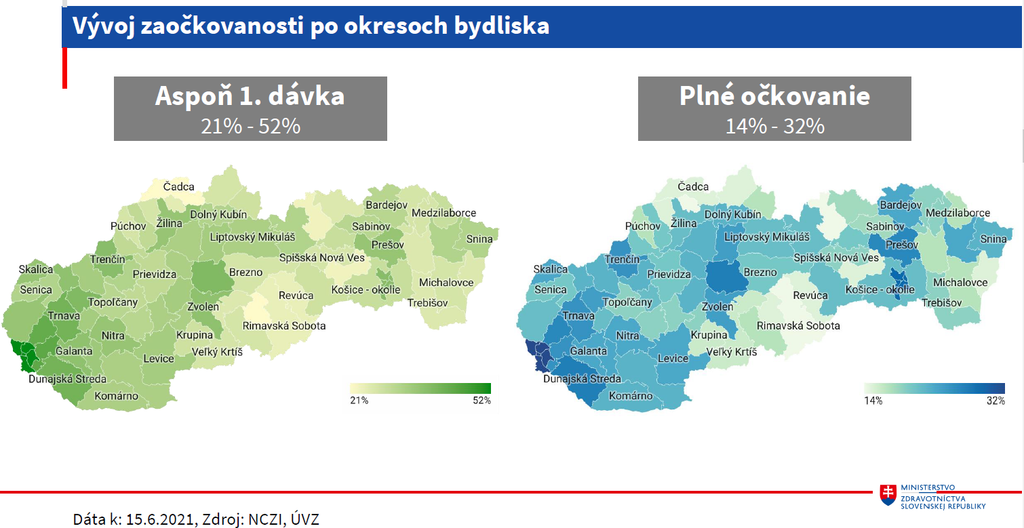Zaočkovanosť je na Slovensku veľmi nerovnomerná. Kým v Bratislave dosahuje už vyše 50 percent, v okrese Čadca je zaočkovaných len 21 percent občanov. Podobne nízky záujem je aj v niektorých častiach Banskobystrického kraja. Hoci župy spustili aj mobilné očkovanie, výrazne to zaočkovanosť zatiaľ nezvýšilo.