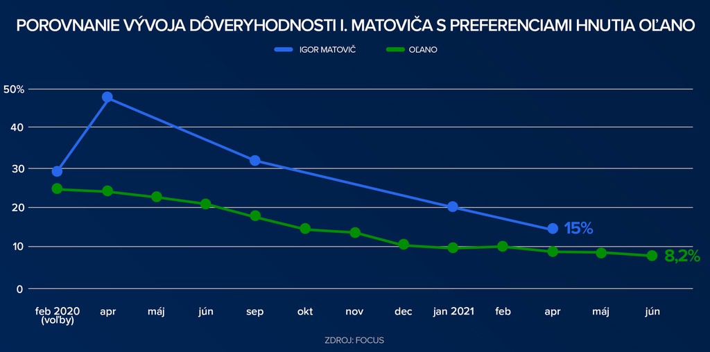 V súčasnosti sa dôvera Matoviča drží niekde na úrovni 10 až 15 percent, čo je najmenej zo všetkých lídrov parlamentných strán a OĽaNO z volebných 25 percent, kleslo na súčasných osem.