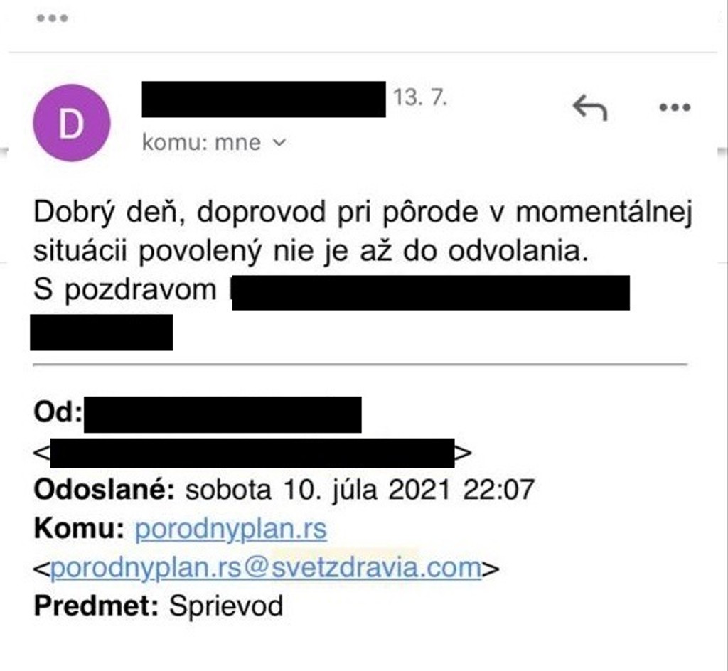 Nemocnicu Rimavská Sobota sme oslovili s otázkou, či povoľujú sprievodnú osobu rodiacim ženám. V oficiálnom stanovisku nemocnica píše opak toho, čo odpísala Silvii.