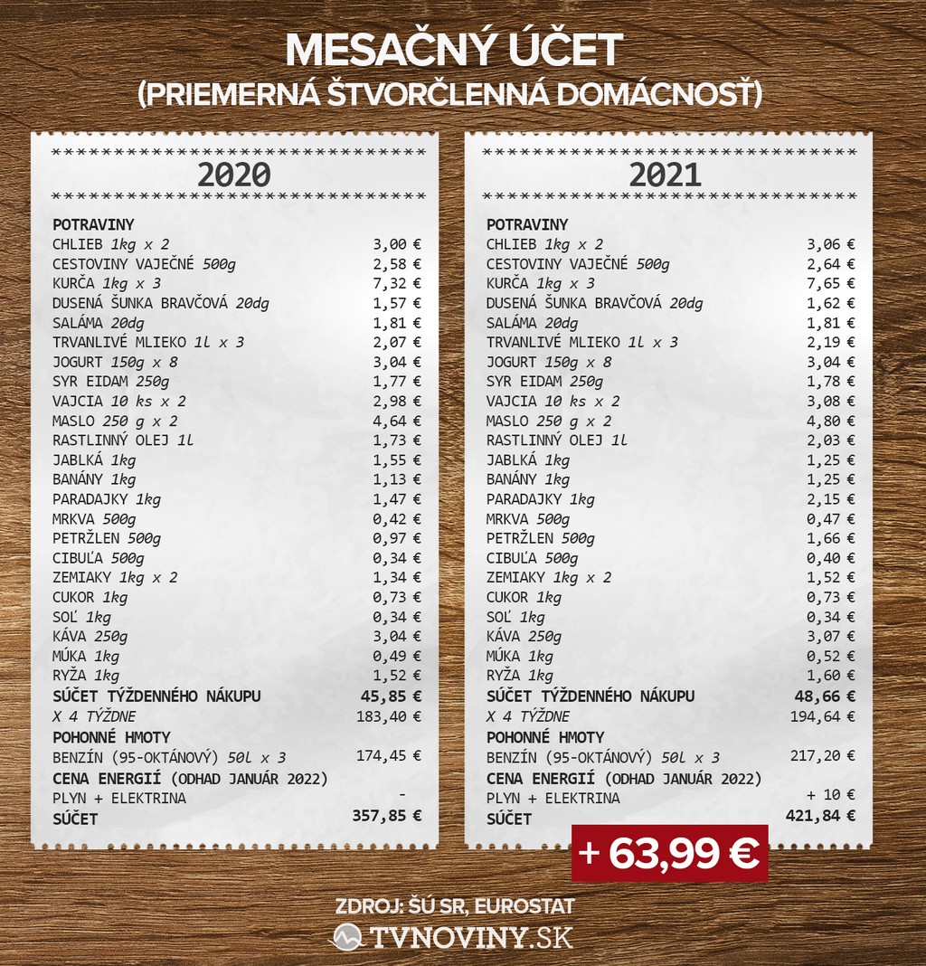 Masívne zdražovanie začína doliehať na peňaženky ľudí. Ceny totiž rastú takmer v každom segmente dennodennej spotreby. Zamerali sme sa preto na potraviny, energie a pohonné hmoty a vypočítali sme, o koľko zaplatia domácnosti mesačne viac v porovnaní s minulým rokom. Vo výsledku nejde o žiadne drobné.