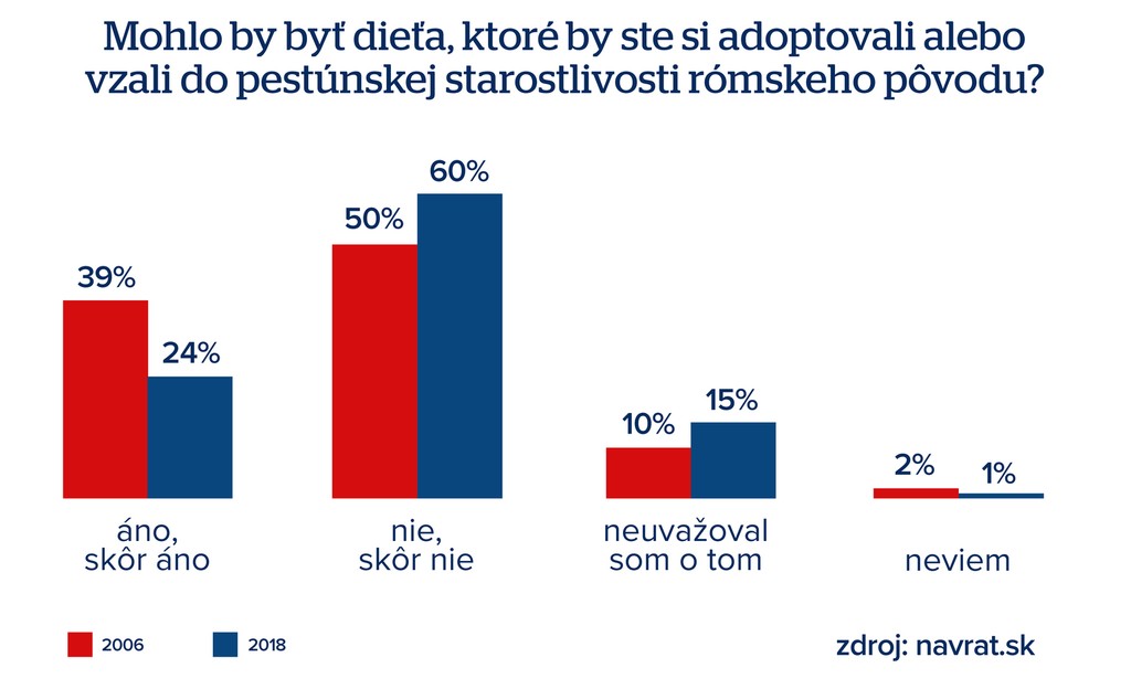Hoci sa môže zdať, že so stúpajúcim počtom adopcií sa zvyšuje aj miera otvorenosti k tejto téme, nie je to tak. Podľa prieskumu Návratu z rokov 2006 a 2018 klesá počet ľudí, ktorí by pristúpili na adopciu. Dokonca sa zhoršilo aj vnímanie rómskych detí.