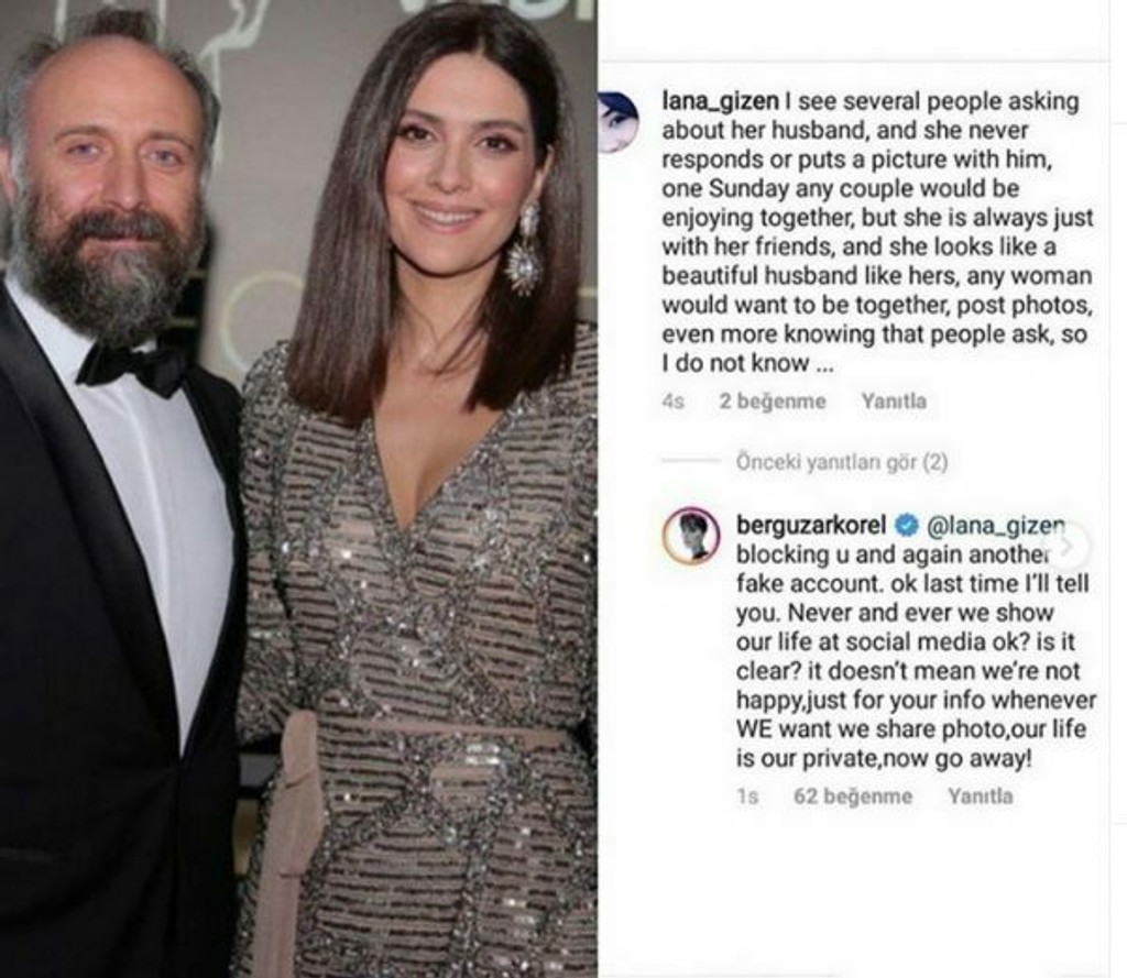Bergüzar jej na to ostro odpísala, že na verejnosti nebude vystavovať svoj osobný život: "Dobre, naposledy ti to vysvetlím. Nikdy neukazujeme náš život na sociálnych sieťach, rozumieš? Je ti to už jasné? Neznamená to, že nie sme šťastní. Len pre tvoju informáciu, kedykoľvek MY chceme, tak fotky zdieľame, náš život je naše súkromie. A teraz už choď preč," odkázala jej herečka, ktorej konto zablokovala a nahlásila.