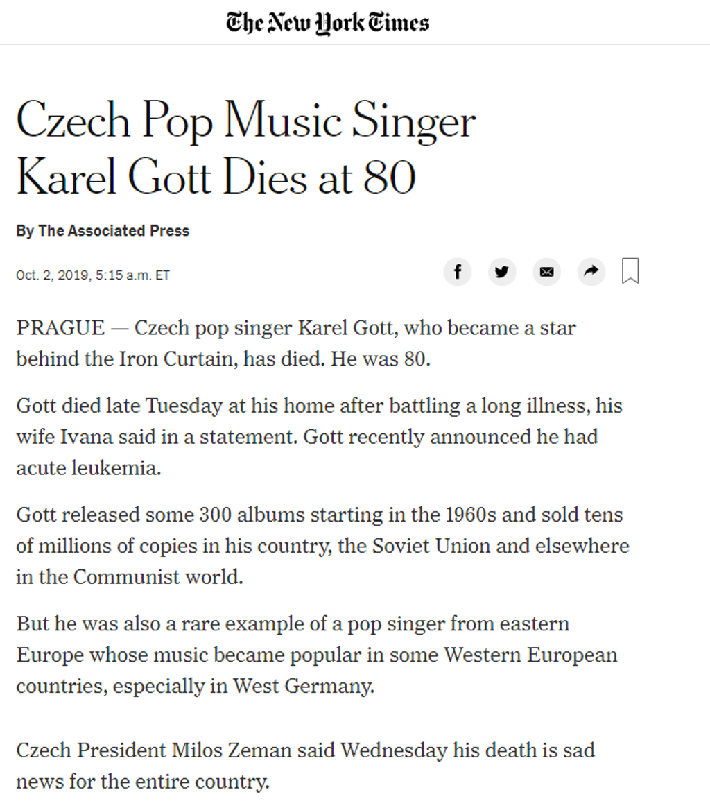 Zomrel Karel Gott, najznámejší Čechoslovák, ktorý bol zrejme aj najznámejším spevákom komunistickej éry. Uviedol to v stredu maďarský spravodajský server 444.hu, podľa ktorého Gott na rozdiel od mnohých hviezd socialistického tábora bol populárnym aj na Západe.