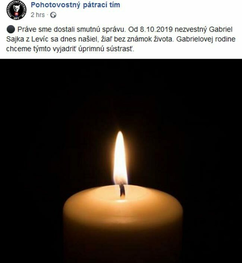 Správu dnes podvečer priniesla FB-stránka Pohotovostný pátrací tím...