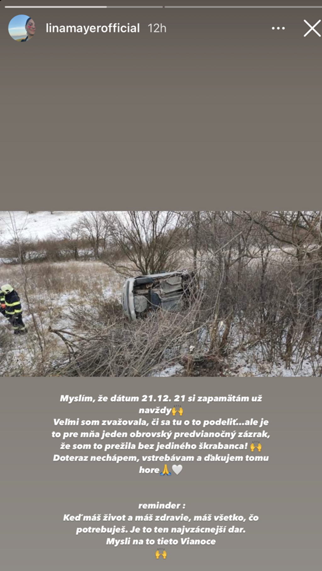 „Myslím si, že dátum 21.12.2021 si zapamätám navždy. Veľmi som zvažovala, či sa o to tu podeliť. Je to pre mňa obrovský predvianočný zázrak, že som to prežila bez jediného škrabanca. Doteraz nechápem, strebávam. Keď máš život a máš zdravie, máš všetko, čo potrebuješ. Je to ten najvzácnejší dar. Mysli na to tieto Vianoce,“ napísala Lina.