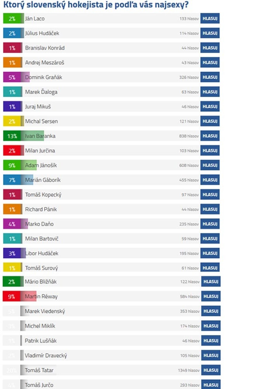 Na prvom mieste s prehľadom a s najvyšším počtom hlasov 1 349 skončil Tomáš Tatar. Na druhom mieste zase Ivan Baranka a tretí najsexy je podľa vás Adam Jánošík.