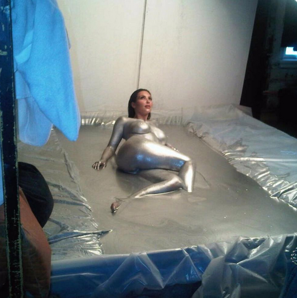 Po fotke s vytŕčajúcim nahým zadkom je na svete ďalšia bizarná snímka. Tehotná Kim Kardashian (34) si tentoraz ľahla do striebornej farby a poriadne sa v nej vyváľala. Ako inak, na sebe nemala nič oblečené.