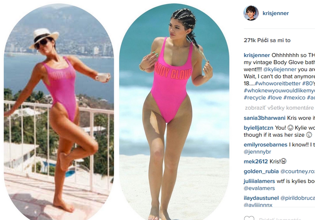 Kylie však nie je prvá, ktorá ich mala na sebe. Ten istý model celých plaviek nosila jej mama pred 26 rokmi. Sama 59-ročná Kris na to upozornila na Instagrame. Pozrite si snímku mamy a dcéry v tých istých plavkách. Ktorá vyzerá lepšie? Hlasujte v našej ankete.