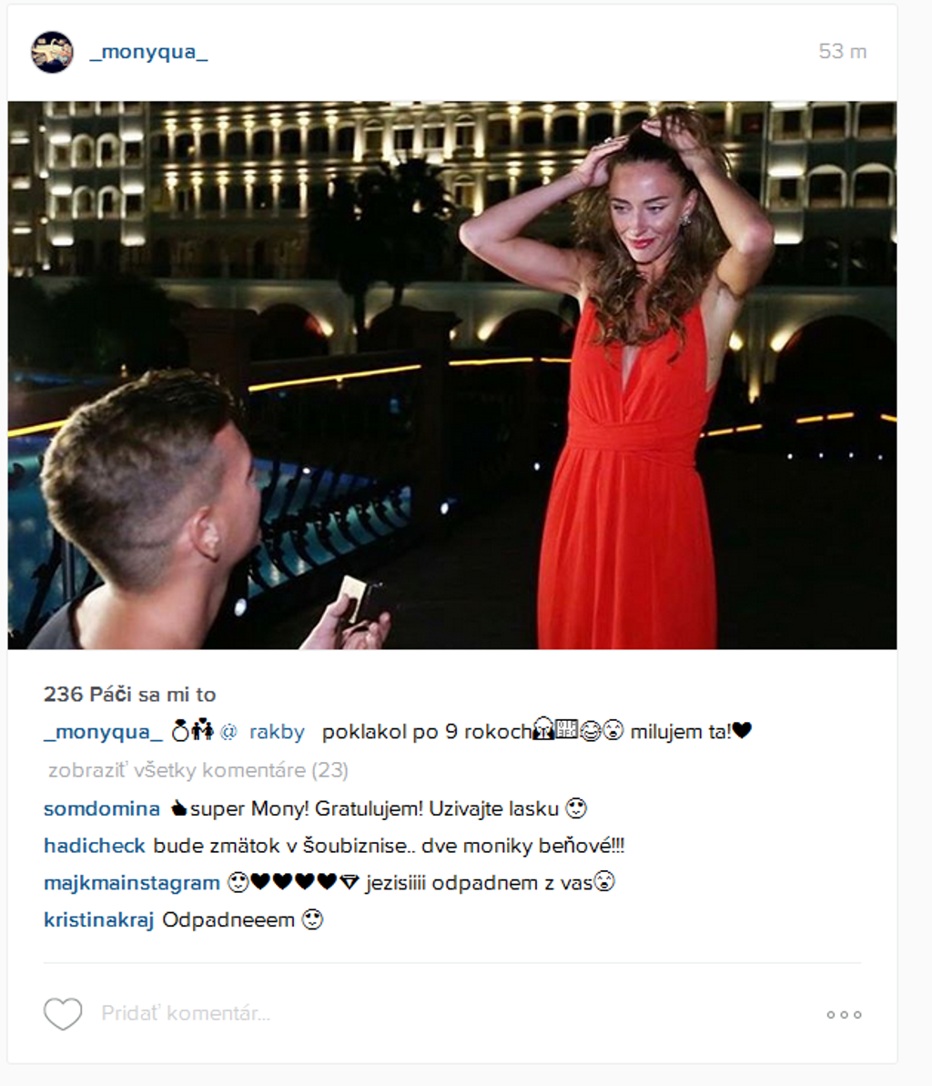 Úspešný raper pokľakol a svoju nádhernú priateľku požiadal o ruku. Tanečníčka Monika snímku zo zásnub zverejnila na sociálnej sieti.