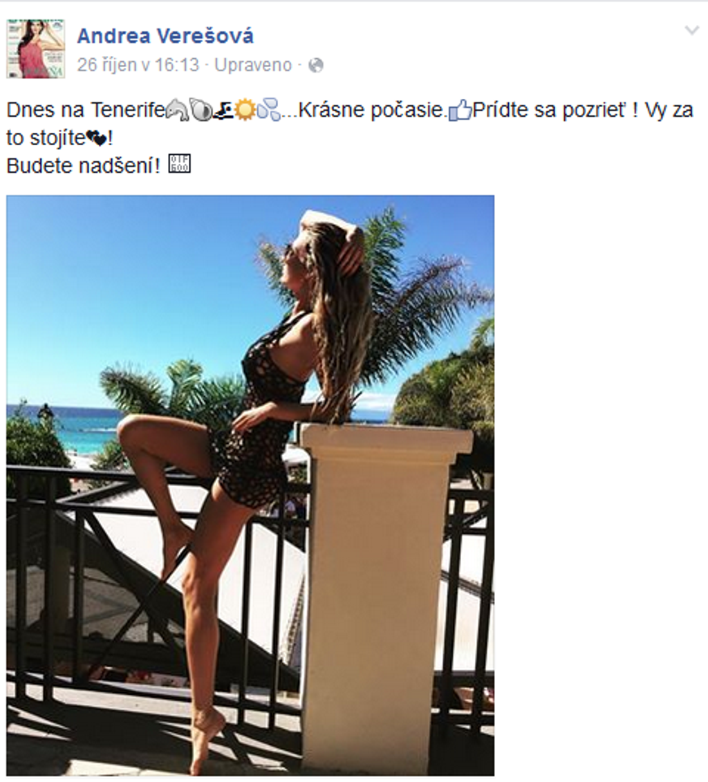 Krásna Andrea Verešová vie spojiť príjemné s užitočným. Keďže stále patrí medzi veľmi žiadané modelky, cestovanie je pre ňu samozrejmosťou. Tentoraz sa sexy Slovenka žijúca v Česku vybrala do slnečného Tenerife