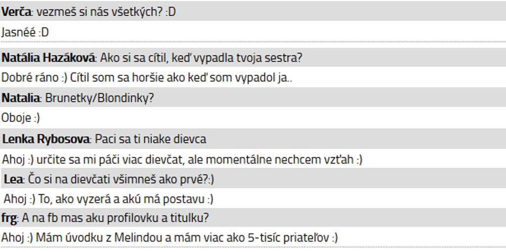 Mladík okrem iného prezradil, čo si na dievčati všimne ako prvé a ktorý facebookový profil je jeho oficiálny. Pozrite si tie najlepšie odpovede z dnešného chatu. Všetky otázky a odpovede nájdete TU.