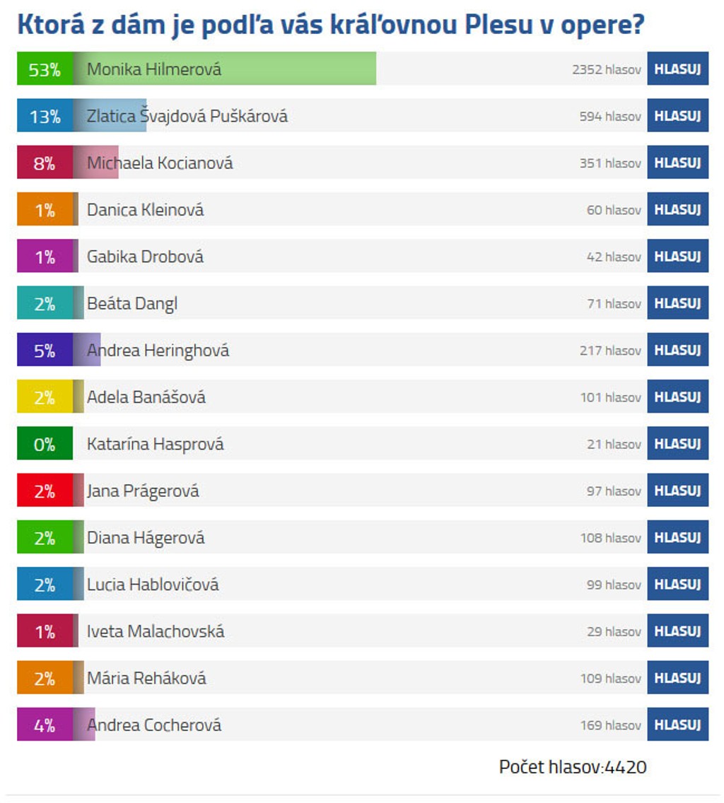 Šestnásty ročník Plesu v opere sa opäť niesol v znamení krásy, elegancie a grácie. My sme vám priniesli hlasovanie o tohtoročnú kráľovnú Plesu v opere. Spomedzi pätnástich dám sa kráľovnou stala naša krásna herečka z Búrlivého vína Monika Hilmerová.