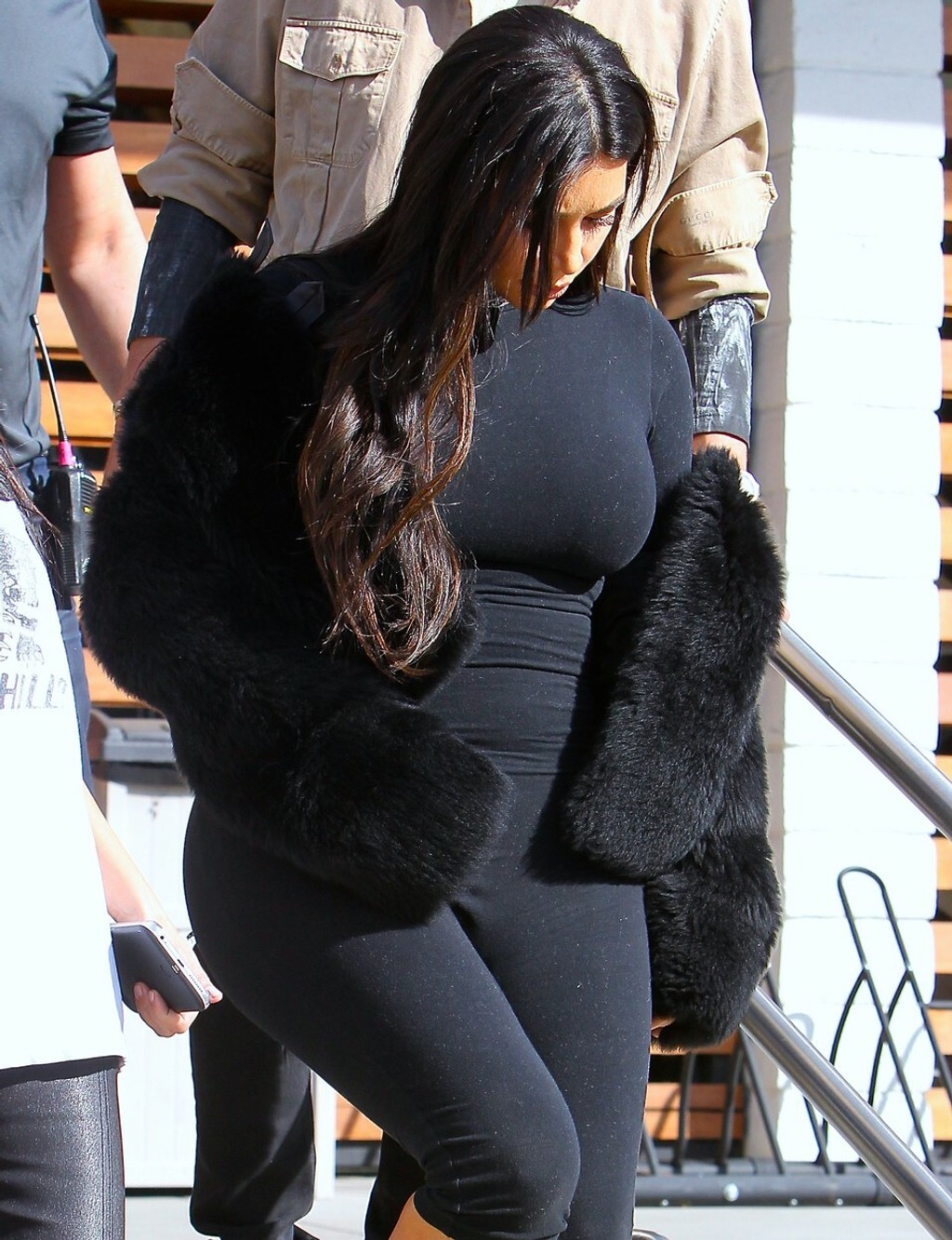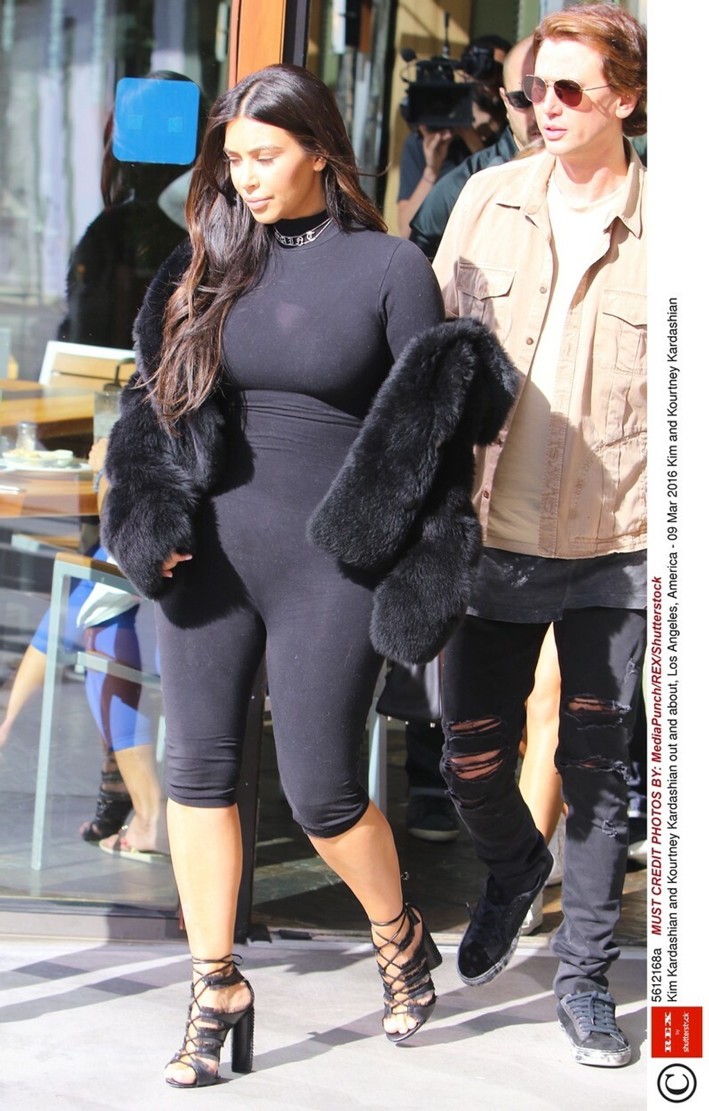 Kim sa so sestrou Kourtney a kamarátmi vybrali na obed do reštaurácie Hugo v Thousands Oaks. Reality hviezda mala na sebe čierny overal, ktorý jej v nohavicovej časti siahal tesne pod kolená. K tomu si obliekla čierny kožušinový kabátik a obula topánky na podpätku.