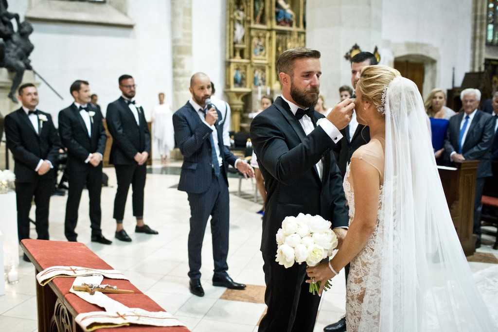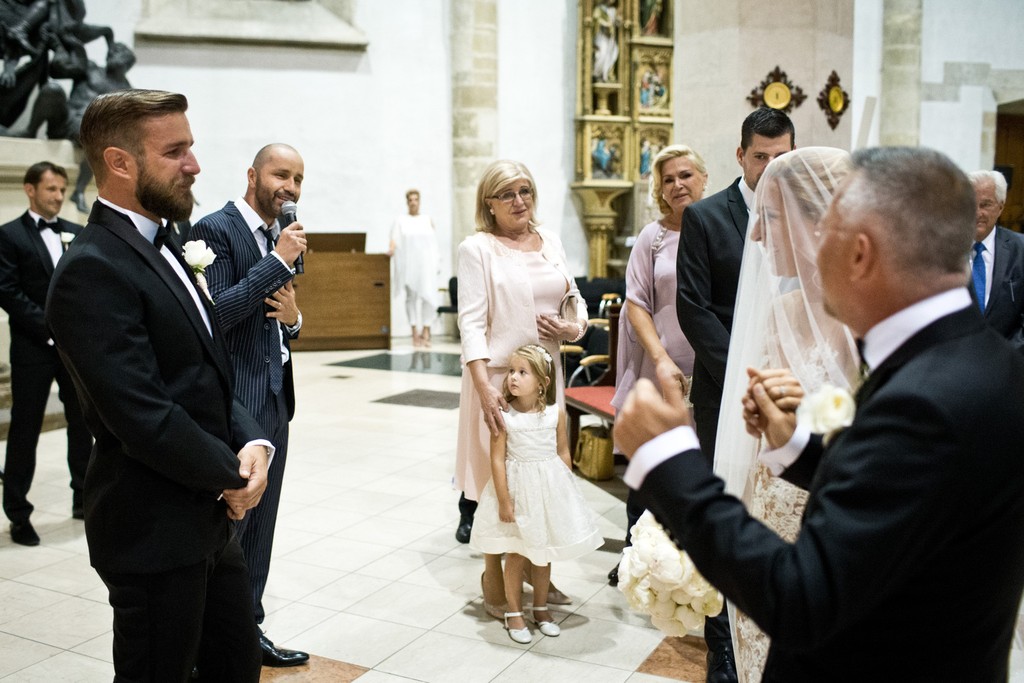 Dominika v nádherných šatách vyrážala dych. Bola naozaj prekrásna nevesta. Po obrade venovala pár minút svojho času aj novinárom. Prezradila, že celý obrad preplakala, bol dojemný a nádherný zároveň. Prispel k tomu aj spevák Robo Opatovský, ktorý v kostole zaspieval pesničku You are so beautiful.