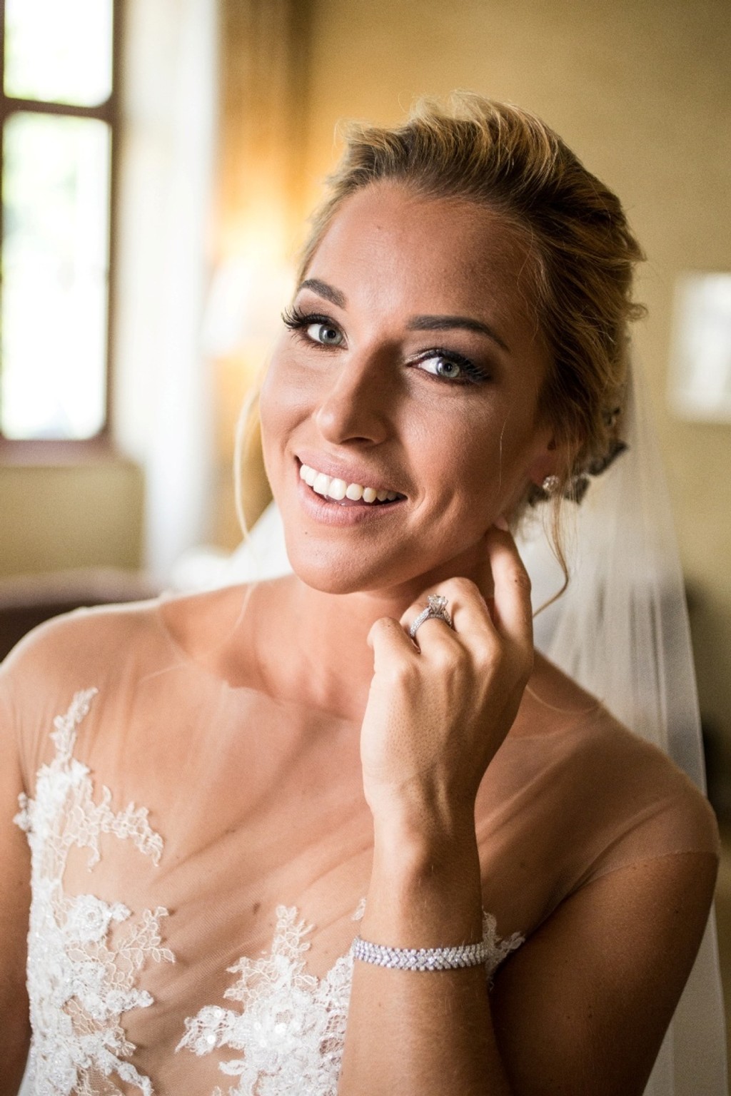 Dominika vyrazila prítomným hosťom dych, keď ladne prešla uličkou v šatách z prehliadkovej kolekcie španielskej značky Pronovias Atelier, ktoré dopĺňali honosné šperky.