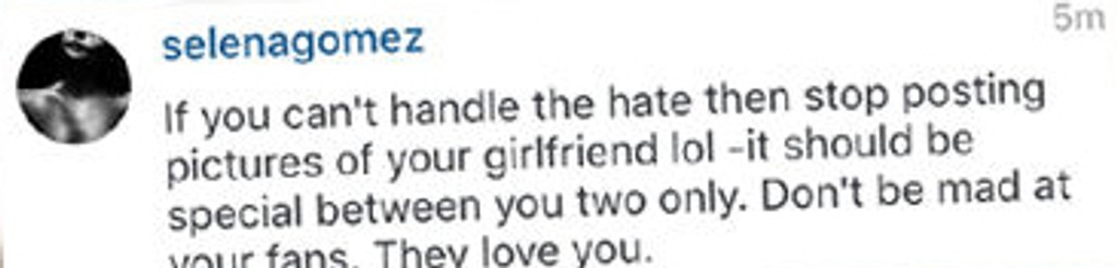 Nikto by nečakal, že na to bude reagovať jeho bývalá priateľka Selena Gomez. Tá mu napísala: "Ak nevieš zniesť aj nenávisť, tak prestaň uverejňovať fotografie s priateľkou. Malo by to byť špeciálne len medzi tebou a ňou. Nehnevaj sa na fanúšikov. Majú ťa radi."