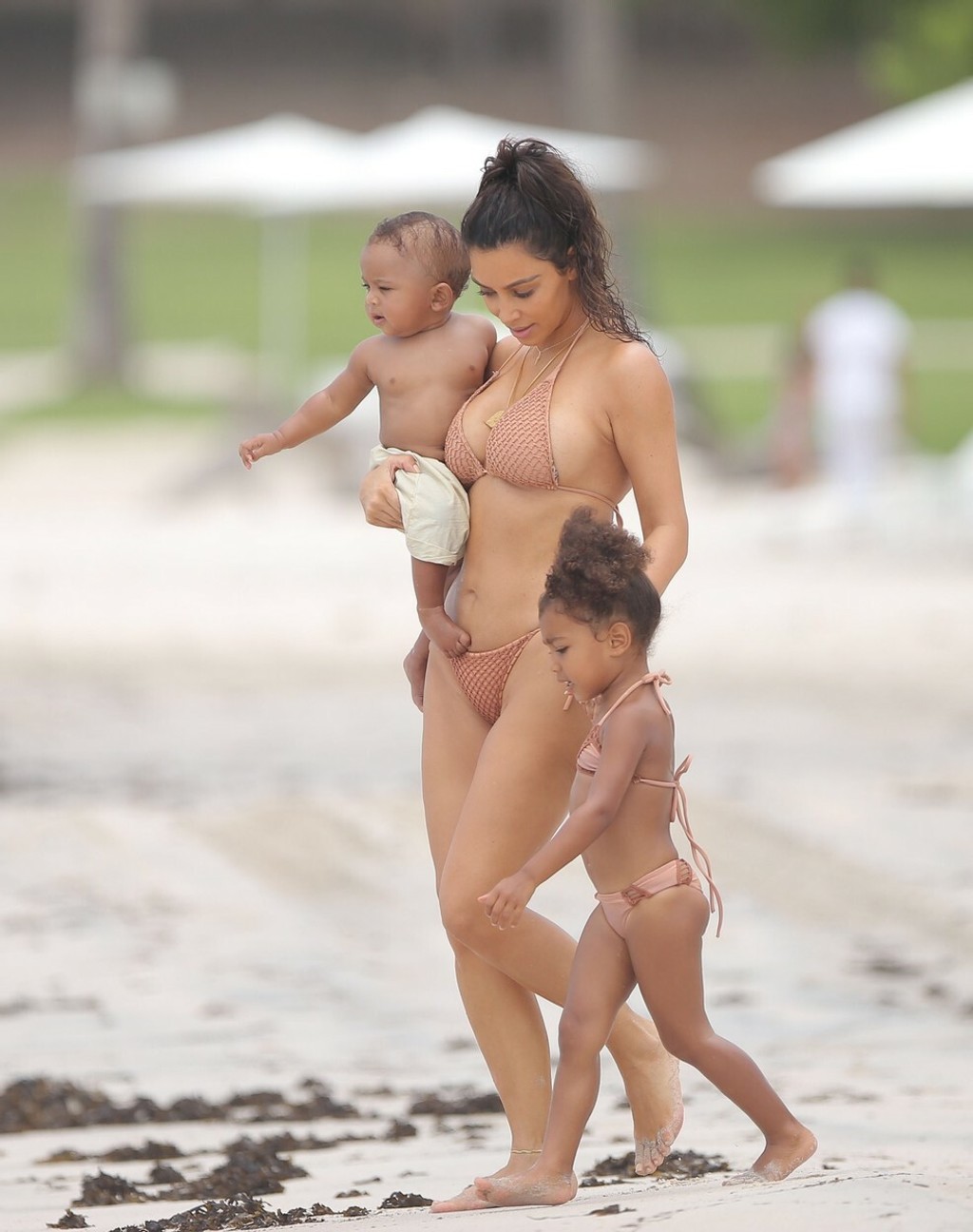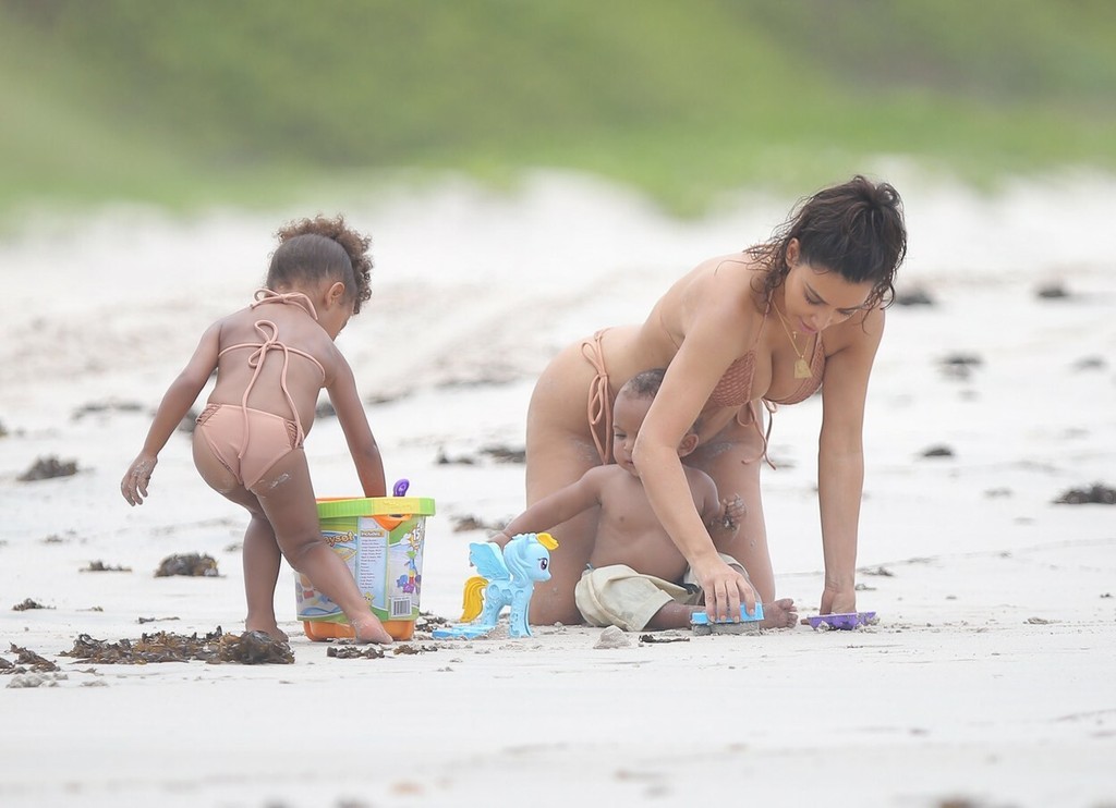 Kim dovolenkuje s rodinnými priateľmi a deťmi v Punta Mita v Mexiku, kde ju na pláži zachytili paparazzi. Manželka rapera Kanyeho Westa sa hrala s dcérkou North a synčekom Saintom na pláži.