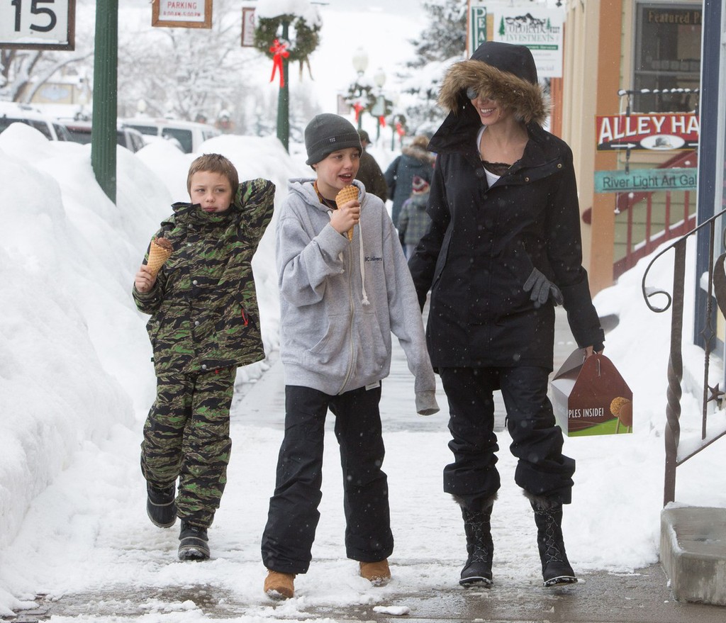 Angelina vyrazila s deťmi na lyže, tie si zdokonaľovali techniku s lyžiarskym inštruktorom. Je vidieť, že herečka si voľné chvíle s nimi naozaj užíva a deťom dopraje všetko, čo im na očiach vidí. Nevadí, že je zima. Chlapci mali chuť na zmrzlinu, tak im ju Angelina kúpila. Herečku aj s ratolesťami strážil na každom kroku bodyguard. Okrem obchodu so sladkosťami samozrejme nemohli vynechať ani miestne hračkárstvo.